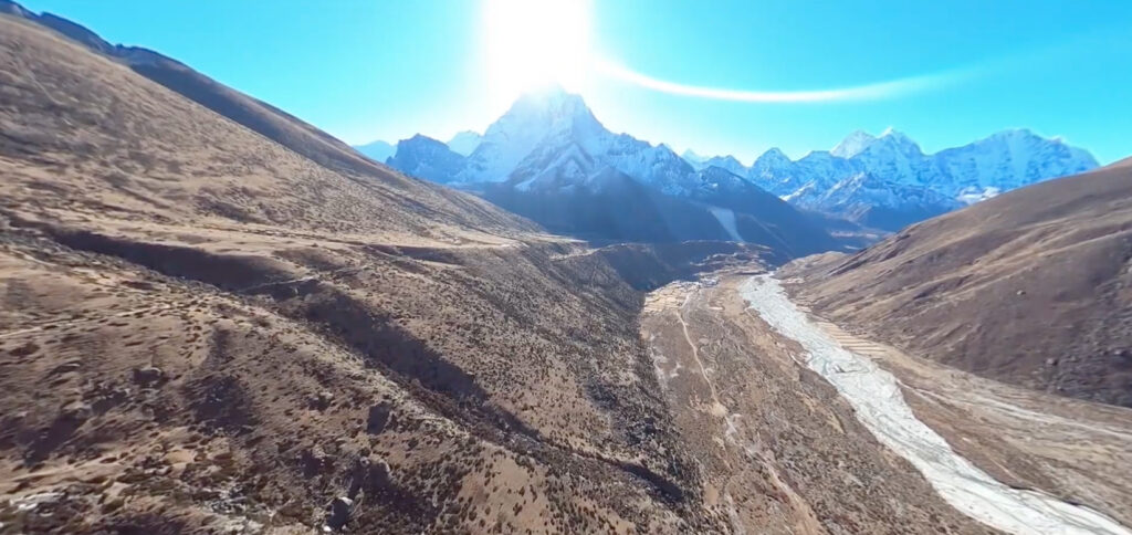 The hike from Dingboche to Pangboche is relaxed and wonderfully scenic. Every step brings uninterrupted views of Ama Dablam, which rises gracefully above the valley like a protective guardian. The descent leads us through open hillsides and traditional fields, with chortens and mani walls reminding us of the deep spiritual roots of the region. The approach to Pangboche has a peaceful, timeless feel.